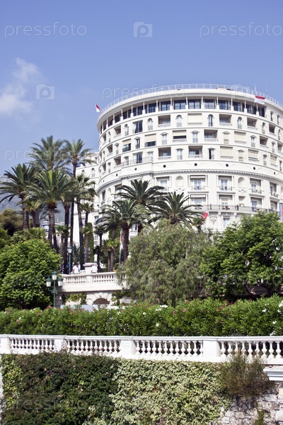 Европейская гостиница на фоне голубого неба и пальм