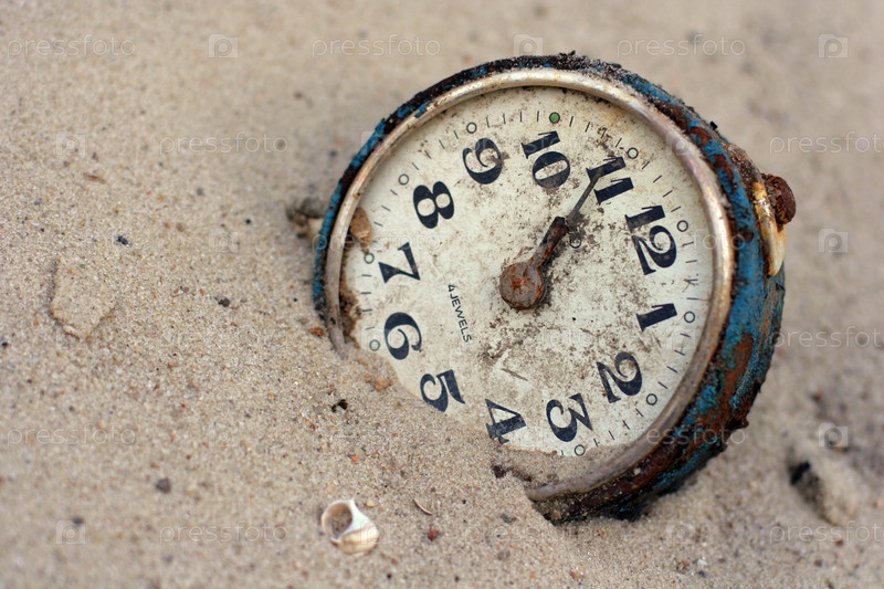Старый будильник, лежащий на песке