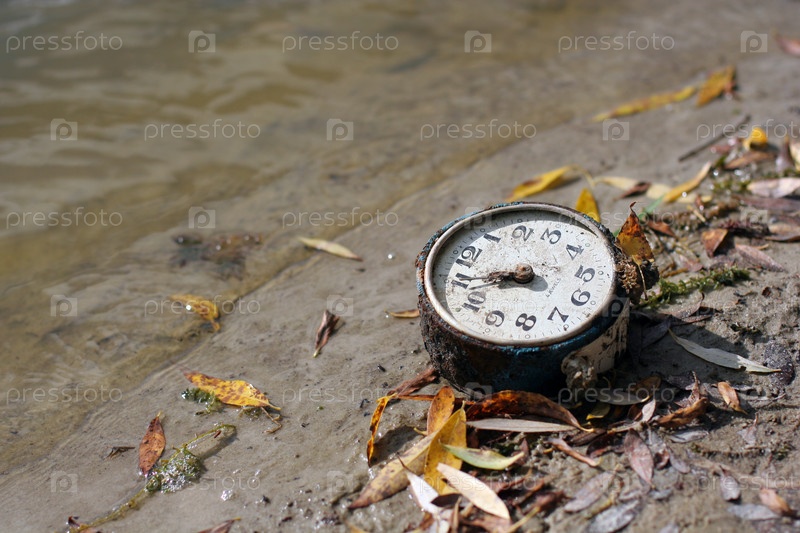 Старый будильник, лежащий у воды