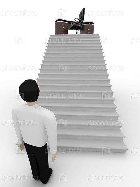Человечек стоит перед высокой лестницей к рабочему месту