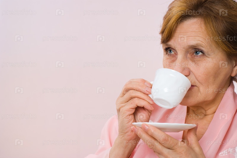 Красивая пожилая женщина пьет кофе