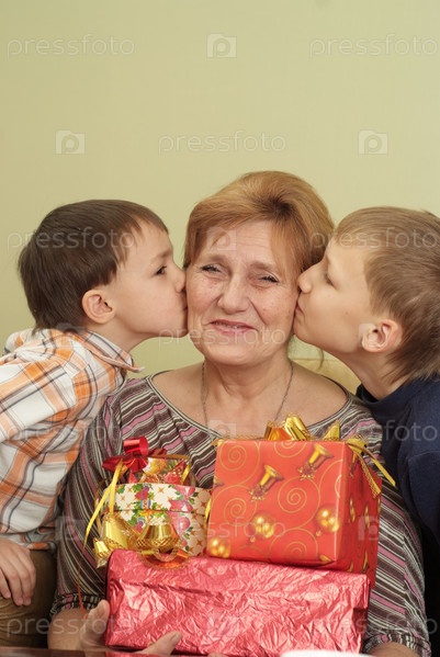 Пожилая женщина с внуками и подарками
