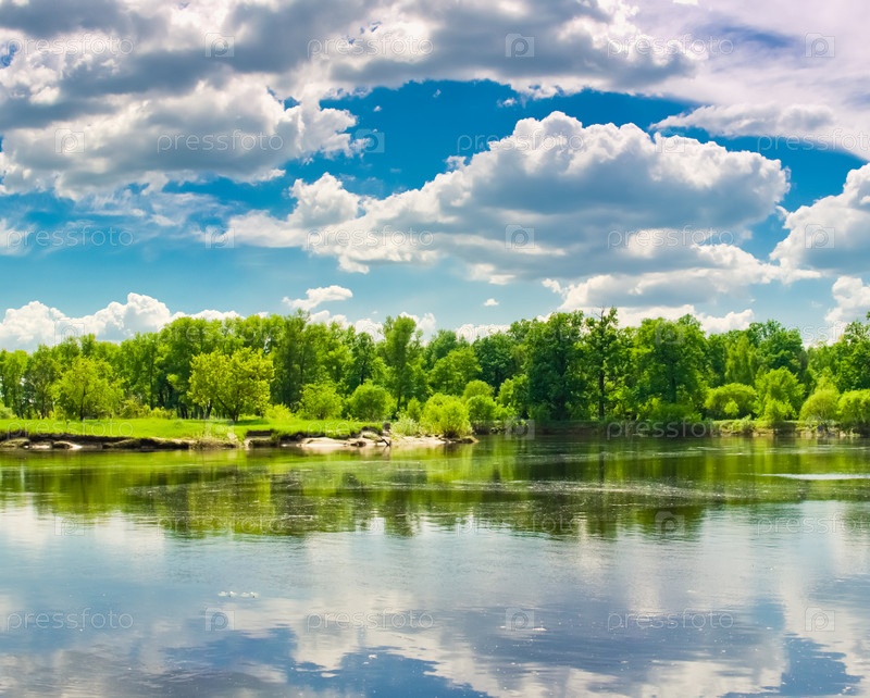 Синее небо и облака отражаются в озере