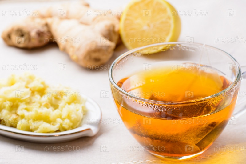 Чашка чая с лимоном, мед и имбирь