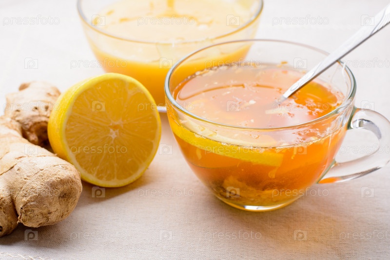 Чашка чая с лимоном, мед и имбирь