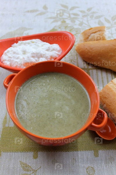 Суп крем из шпината и брокколи с багетом и натуральный йогурт