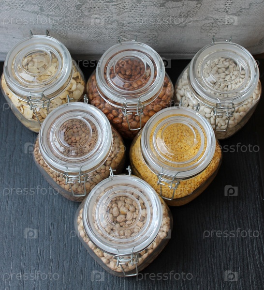 Зерна и бобов в стеклянных банках в кухне