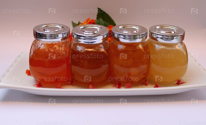 Варенье из айвы, персики, абрикосы и мед в стеклянных банках