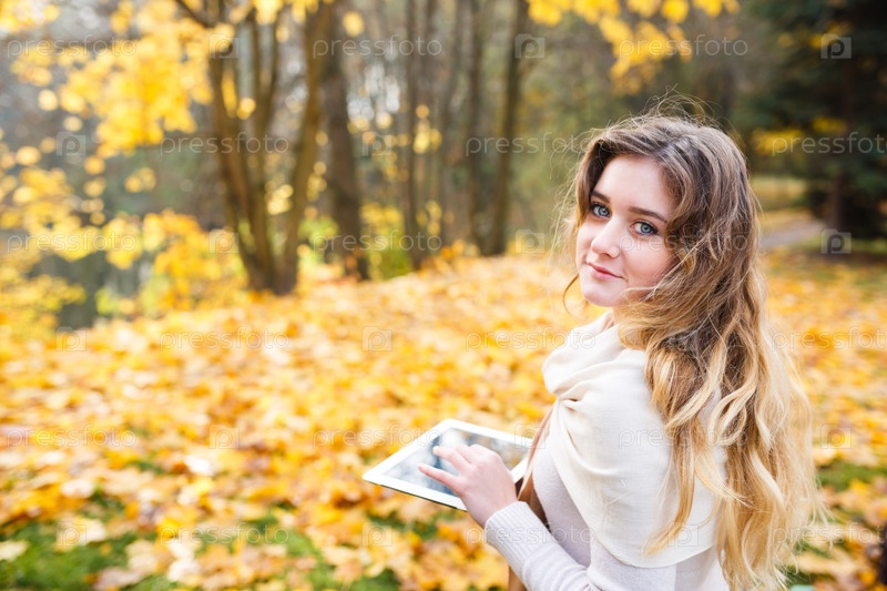 Девушка с планшетом в парке