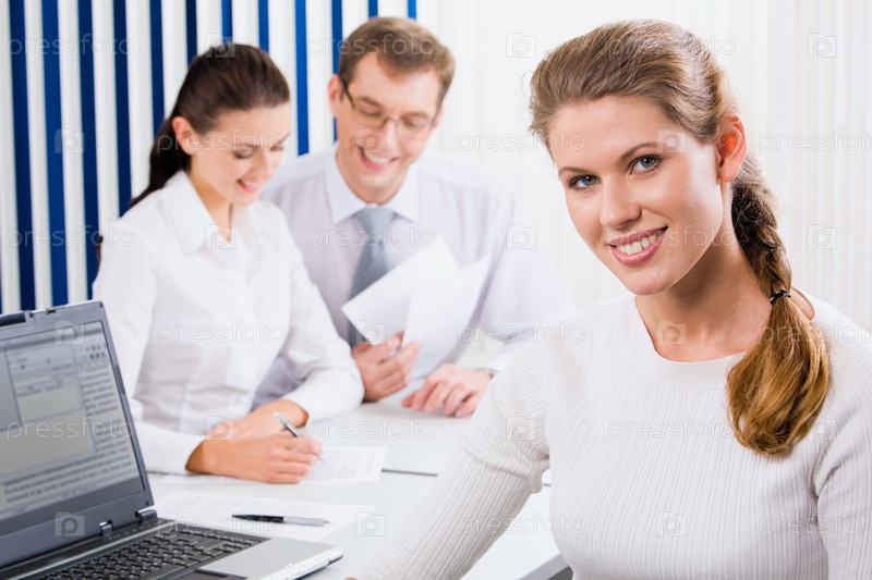 Портрет интеллектуальной женщины в белом на фоне двух коллег