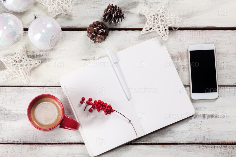 Открытой записной книжки на деревянный стол с телефоном