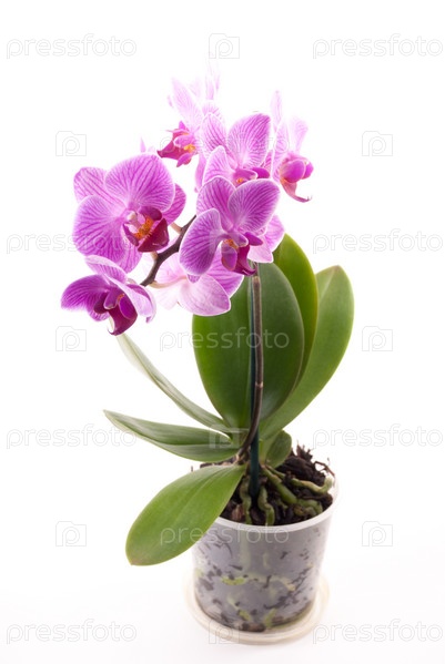 Розовые орхидеи в горшке на белом фоне