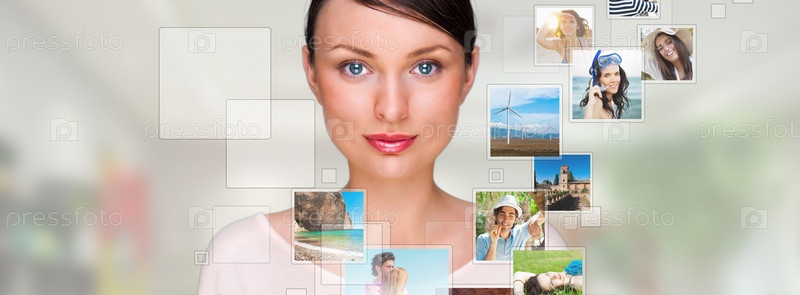 Портрет молодой женщины с различными фотографиями вокруг нее