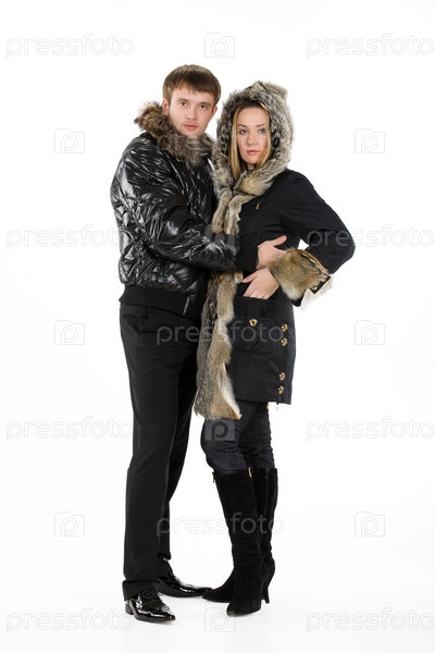 Молодая женщина и мужчина в меховых пальто