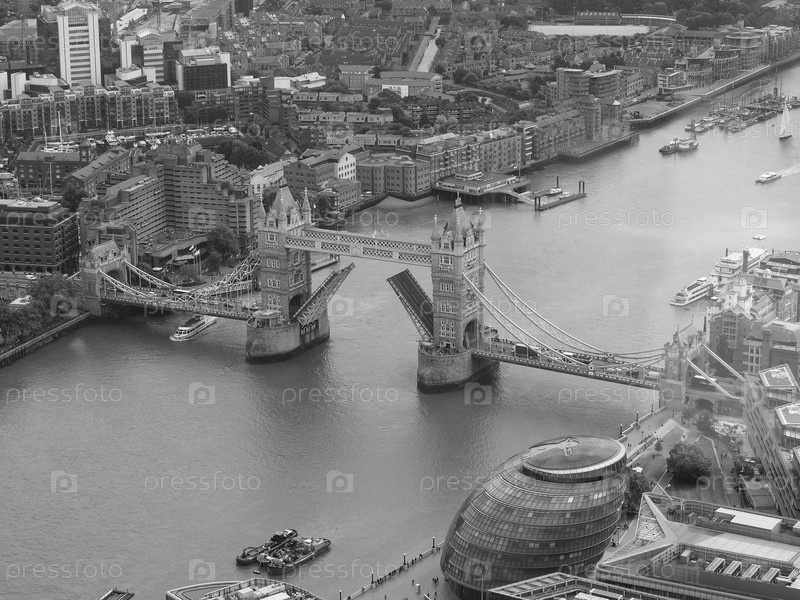 Аэрофотоснимок Тауэрского моста в Лондоне, Великобритания в черно-белом