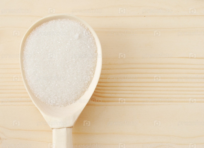 Сахар-песок в деревянной ложке на столе
