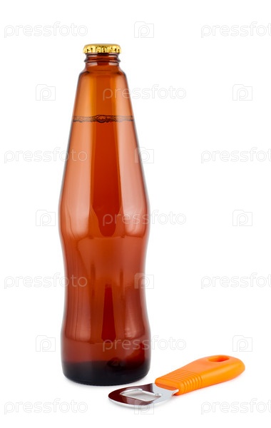 Пиво в бутылке и открывалка, изолировано на белом
