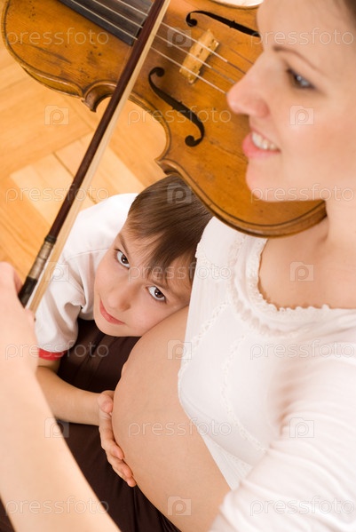 Беременная женщина, играющая на скрипке, с сыном