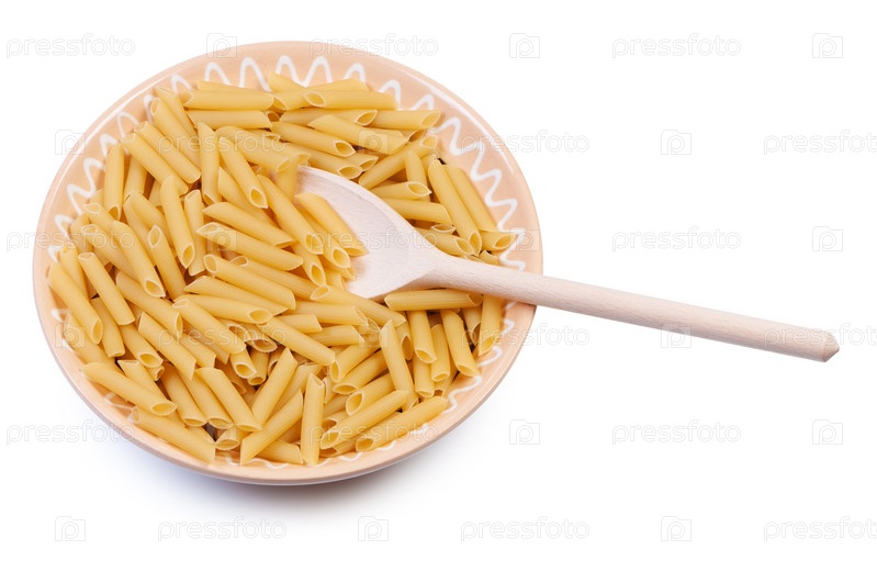 Тарелка сырых макарон и деревянная ложка, на белом фоне