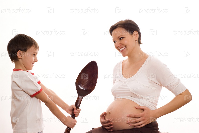 Сын дает беременной матери большую деревянную ложку