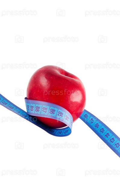 Измерительная лента и яблоко, изолированы на белом фоне