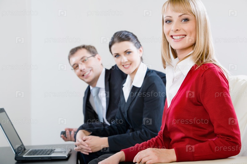 Группа из трех молодых успешных бизнесменов, сидящих на диване в комнате