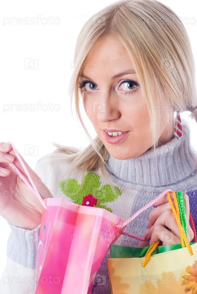 Молодая женщина с пакетами после шоппинга на изолированные фоне