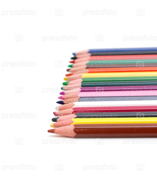 Карандаши лежат в ряд на белом фоне с небольшой глубиной остроты