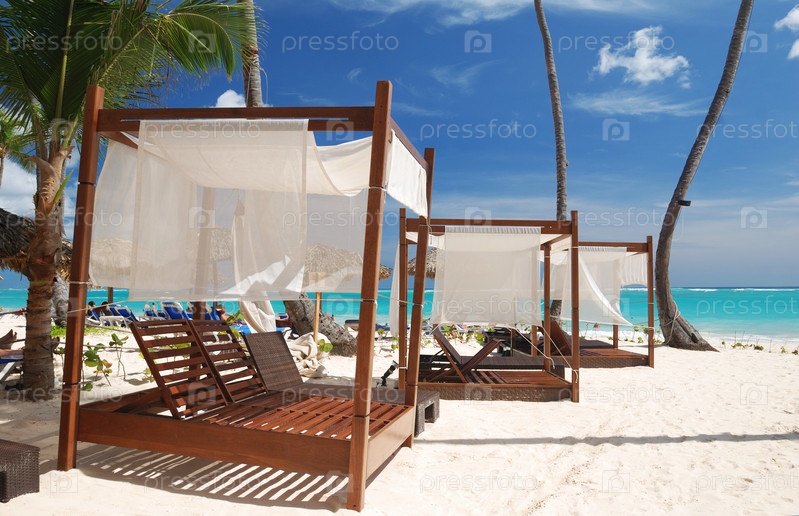 Роскошные шезлонги на Карибском пляже в Доминиканской республике