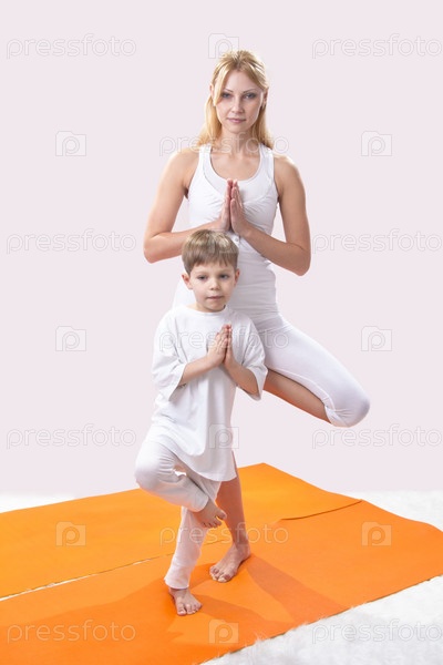 Красивая молодая мать практикует йогу с сыном