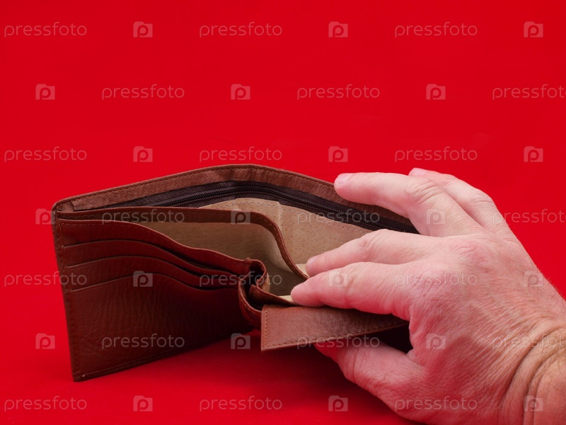 Рука держит пустой кошелек на красном фоне