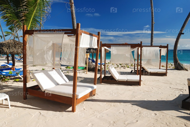 Роскошные шезлонги на песчаном пляже острова Гаити