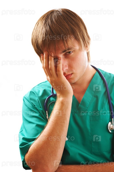 Уставший доктор со стетоскопом на белом фоне