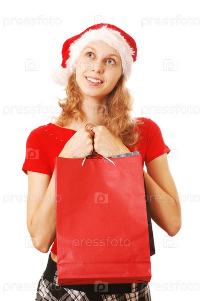 Девушка в новогоднем колпаке с красным бумажным пакетом