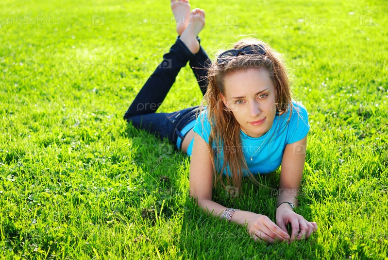 Портрет молодой девушки, лежащей на зеленой траве
