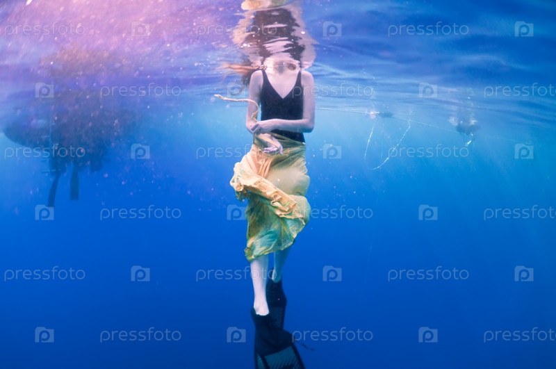 Девушка в желтой юбке и ее отражение на поверхности моря, подводный вид