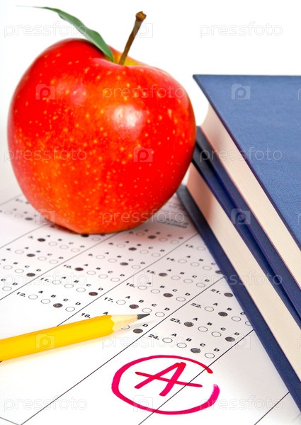 Экзаменационный лист с оценкой, яблоко и книги