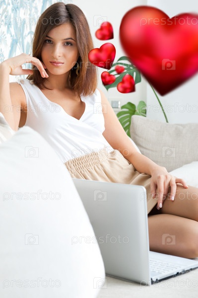 Портрет молодой девушки, сидящей на диване с ноутбуком