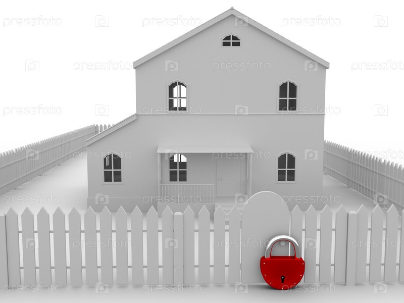 Макет дома с забором и висячим замком на белом фоне