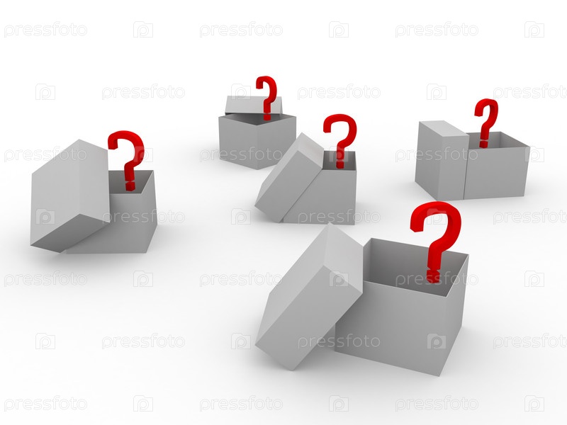 Пять открытых пустых коробок с красными вопросительными знаками