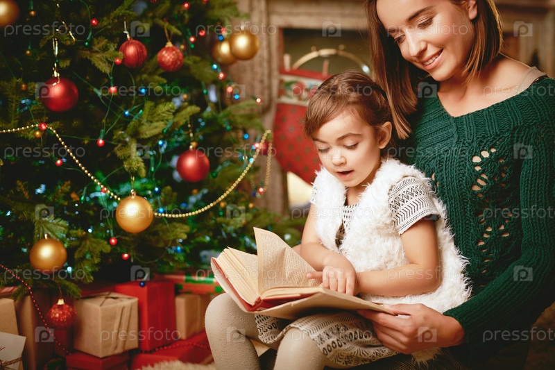 Мама и ее дочь читают Рождественскую сказку