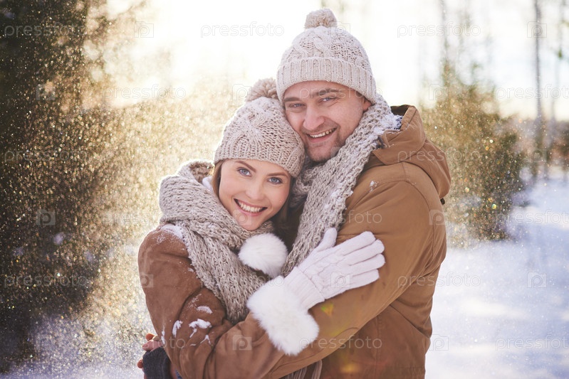 Счастливая пара в зимнем парке
