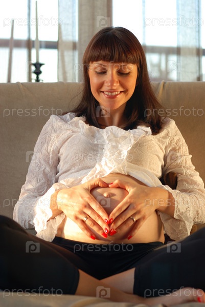 Беременная женщина сидит на диване