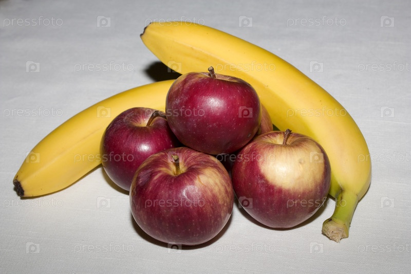 Бананы и яблоки на белом фоне
