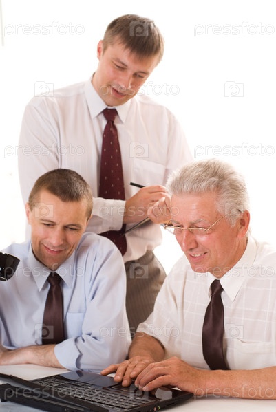 Совместная работа. Три бизнесмена за ноутбуком. Изолированные на белом фоне