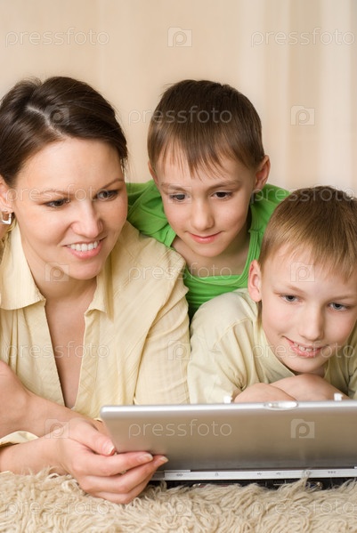 Счастливая мать с детьми у ноутбука