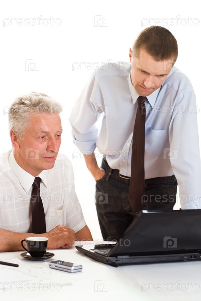 Два бизнесмена совместно работают на ноутбуке на белом фоне