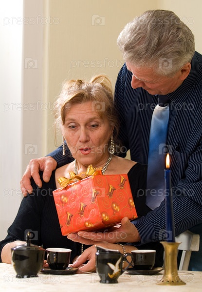 Пожилой мужчина дарит жене подарок