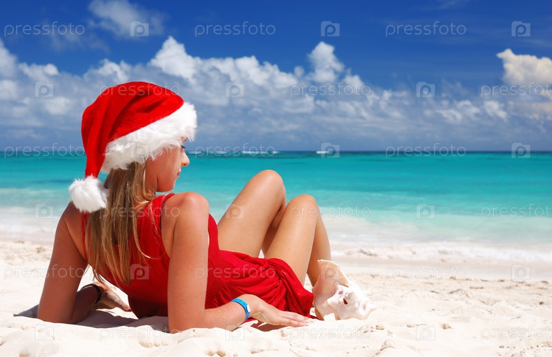 Девушка в новогодней шапке на лежит пляже