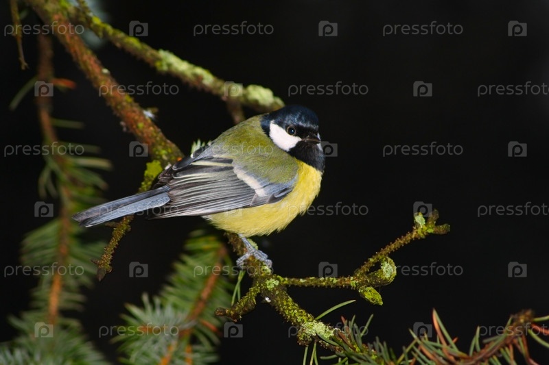 Синица на ветке на черном фоне